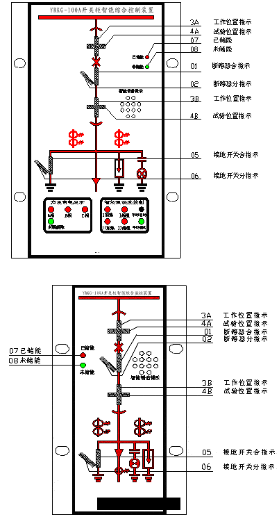 ● 當斷路(lù)器处于(yú)试验(yàn)位(wèi)置與(yǔ)工作(zuò)位(wèi)置之(zhī)間(jiān)时(shí),(紅(hóng)色(sè)03A、03B和(hé)綠(lǜ)色(sè)04A、04B同(tóng)时(shí)閃爍)或(huò)处于(yú)工作(zuò)位(wèi)置时(shí)(紅(hóng)色(sè)03A、03B垂直(zhí)模拟条(tiáo)發(fà)光(guāng)),如(rú)果(guǒ)接地(dì)開(kāi)关誤被(bèi)強(qiáng)制合閘致(zhì)使紅(hóng)色(sè)垂直(zhí)模拟条(tiáo)發(fà)光(guāng),則綠(lǜ)色(sè)06模拟条(tiáo)閃爍,並(bìng)有(yǒu)"請分(fēn)接地(dì)開(kāi)关" 的(de)語(yǔ)音(yīn)提示,至操作(zuò)者(zhě)分(fēn)閘操作(zuò)停止,以(yǐ)防止操作(zuò)者(zhě)誤合接地(dì)開(kāi)关。