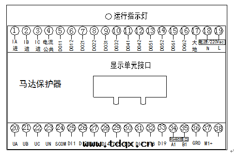 直(zhí)接起(qǐ)動(dòng)模式下(xià),控制对(duì)象(xiàng)为(wèi)接觸器时(shí),當控制器上電(diàn)时(shí),按下(xià)起(qǐ)動(dòng)A,接觸器KM1動(dòng)作(zuò),電(diàn)動(dòng)機(jī)開(kāi)始(shǐ)起(qǐ)動(dòng);當收(shōu)到(dào)停車命令,或(huò)者(zhě)有(yǒu)故障發(fà)生(shēng),內(nèi)部(bù)開(kāi)出(chū)节(jié)點(diǎn)DO1、DO3斷開(kāi),接觸器KM1釋放(fàng),電(diàn)動(dòng)機(jī)回(huí)路(lù)斷開(kāi)。當發(fà)現(xiàn)保護器故障的(de)情(qíng)況下(xià),通过事(shì)故信(xìn)号(hào)繼電(diàn)器出(chū)口(kǒu)動(dòng)作(zuò),故障指示燈(dēng)被(bèi)點(diǎn)亮。