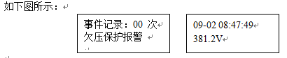 上图(tú)所(suǒ)示: “00次(cì)”表(biǎo)示最近一(yī)次(cì)事(shì)件(jiàn)記(jì)录(lù),“欠(qiàn)壓保護報警”为(wèi)事(shì)件(jiàn)記(jì)录(lù)內(nèi)容,保護動(dòng)作(zuò)时(shí)間(jiān)为(wèi)9月(yuè)2日(rì) 10时(shí)47分(fēn)49秒,線(xiàn)電(diàn)壓最大(dà)值为(wèi)381.3V。