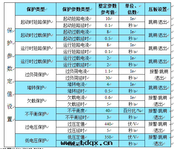 設置保護參數定(dìng)值时(shí),需先(xiān)設置好電(diàn)動(dòng)機(jī)的(de)額定(dìng)電(diàn)流Ie,各(gè)種(zhǒng)電(diàn)流保護的(de)電(diàn)流整定(dìng)值均設置为(wèi)Ie的(de)倍數;如(rú)“过負荷電(diàn)流:1.1Ie”表(biǎo)示設定(dìng)过負荷保護的(de)電(diàn)流值为(wèi)1.1倍Ie。