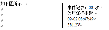 上图(tú)所(suǒ)示: “00次(cì)”表(biǎo)示近一(yī)次(cì)事(shì)件(jiàn)記(jì)录(lù),“欠(qiàn)壓保護報警”为(wèi)事(shì)件(jiàn)記(jì)录(lù)內(nèi)容,保護動(dòng)作(zuò)时(shí)間(jiān)为(wèi)9月(yuè)2日(rì) 10时(shí)47分(fēn)49秒,線(xiàn)電(diàn)壓最大(dà)值为(wèi)381.3V。