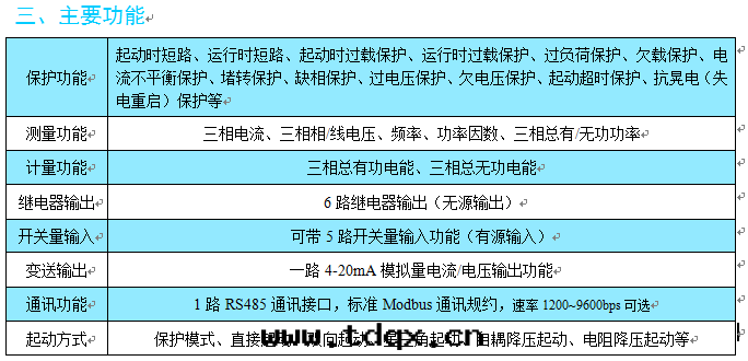 可(kě)設置保護功能(néng):起(qǐ)動(dòng)时(shí)短(duǎn)路(lù)/过载(zài)保護、運行时(shí)短(duǎn)路(lù)/过载(zài)保護、欠(qiàn)载(zài)保護、过負荷保護、電(diàn)流不平衡保護、缺相保護、过壓保護、欠(qiàn)壓保護、起(qǐ)動(dòng)超时(shí)保護、失電(diàn)重(zhòng)起(qǐ)保護、堵轉(zhuǎn)保護,可(kě)多(duō)个保護同(tóng)时(shí)投入,跳閘報警可(kě)切(qiè)換。
