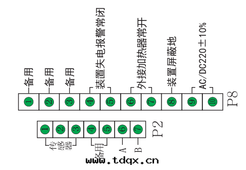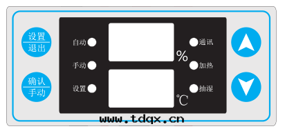2.3設置温(wēn)度(dù)啟動(dòng)值:當抽湿(shī)装置工作(zuò)正(zhèng)常状态下(xià)(双(shuāng)层(céng)數碼管(guǎn)顯示當前(qián)温(wēn)湿(shī)度(dù)值时(shí)即为(wèi)正(zhèng)常状态),按“設置/退(tuì)出(chū)”鍵,抽湿(shī)装置進(jìn)入設置状态,按“向上”或(huò)“向下(xià)”按鍵,直(zhí)到(dào)上排數碼管(guǎn)顯示P3(當上排數碼顯示P1时(shí),表(biǎo)示下(xià)排顯示的(de)數值为(wèi)湿(shī)度(dù)啟動(dòng)值;當上排數碼顯示P2时(shí),表(biǎo)示下(xià)排顯示的(de)數值为(wèi)湿(shī)度(dù)斷開(kāi)值;當上排數碼顯示P3时(shí),表(biǎo)示下(xià)排顯示的(de)數值为(wèi)温(wēn)度(dù)啟動(dòng)值;P4时(shí),表(biǎo)示本(běn)機(jī)通訊地(dì)址;P5时(shí),表(biǎo)示制冷片(piàn)停止制冷動(dòng)作(zuò)值;),按“确定(dìng)/手(shǒu)動(dòng)”按鍵,下(xià)排的(de)數字(zì)閃爍,此(cǐ)时(shí)按“向上”或(huò)“向下(xià)”按鍵可(kě)修改温(wēn)度(dù)的(de)斷開(kāi)值;修改完成(chéng)後(hòu)按“确定(dìng)/手(shǒu)動(dòng)”鍵保存,數字(zì)停止閃爍;修改温(wēn)度(dù)啟動(dòng)值設置完成(chéng)。